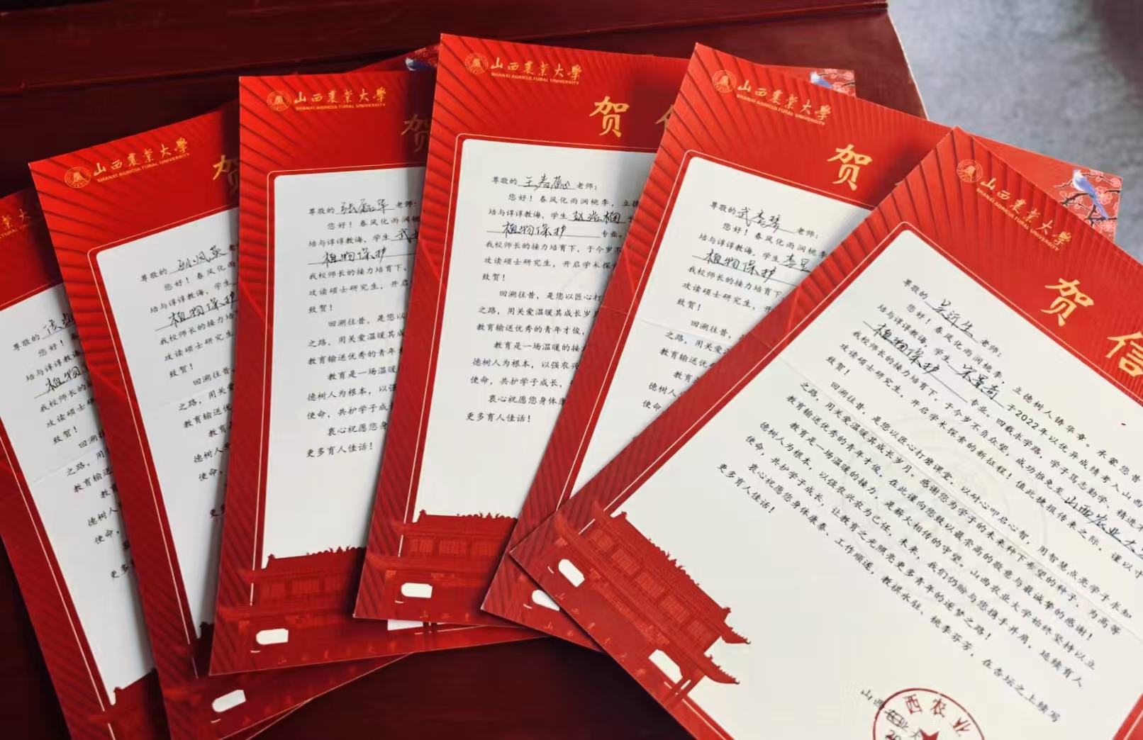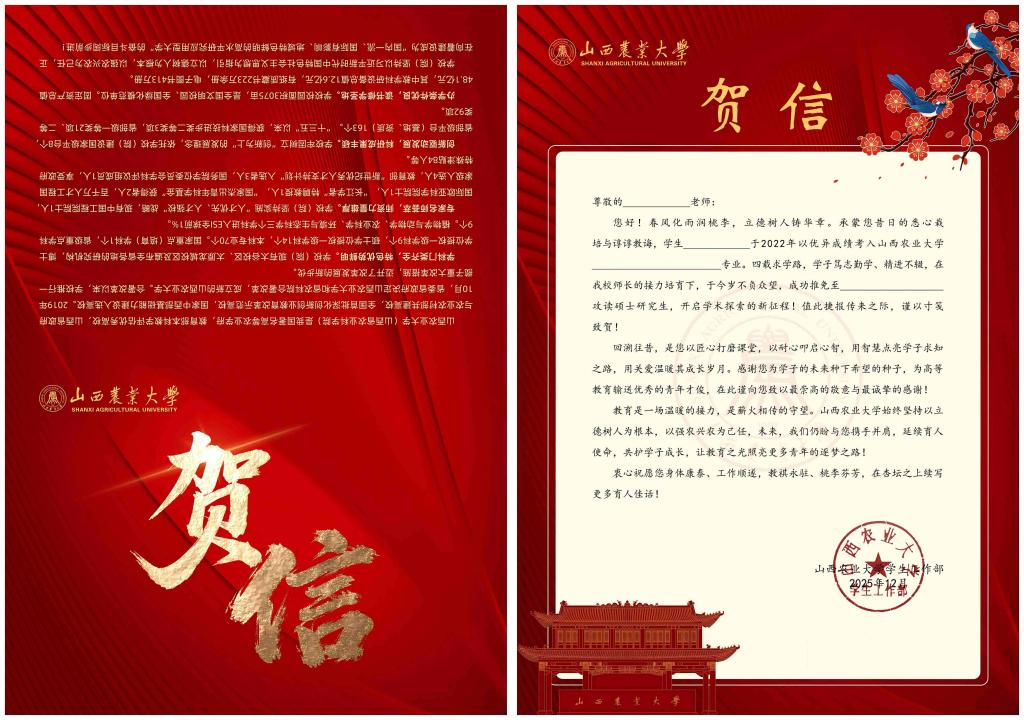 山西农业大学始终坚持立德树人根本任务,重视学生的全过程培养与全方位发展。这份飞向全国各地的贺信,不仅传递了学子们的成长喜悦,也是学校落实“三全育人”工作的具体体现,彰显了学校“为党育人、为国育才”的使命担当。今后,学校将继续深化教育教学改革,完善协同育人机制,为培养更多知农爱农新型人才、服务农业强国建设贡献更大力量。