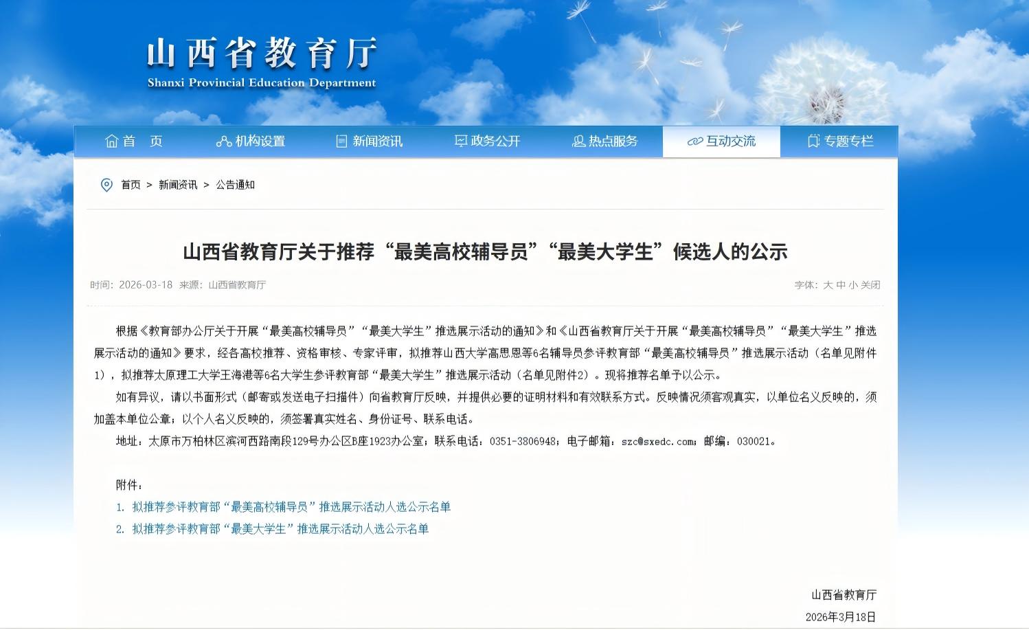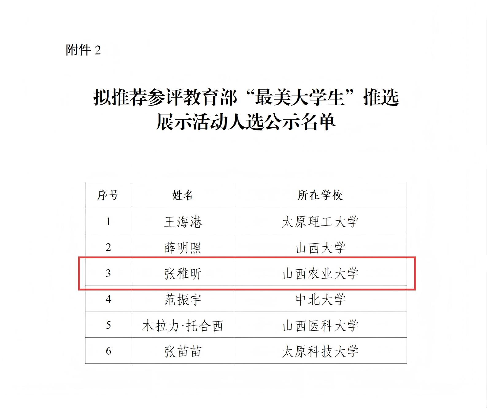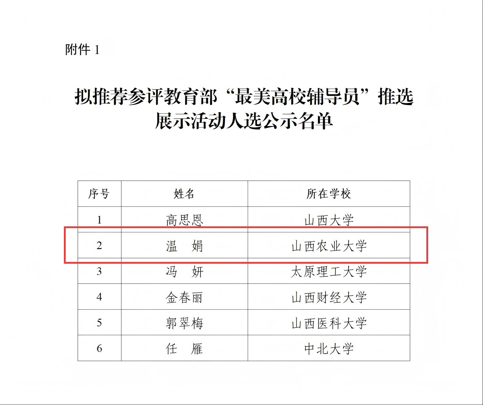 近日,山西省教育厅发布关于推荐“最美高校辅导员”“最美大学生”候选人的公示,我校温娟老师和张稚昕同学分别被推荐参评教育部“最美高校辅导员”“最美大学生”推选展示活动。